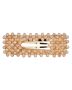 Et stilrent hårspænde, der løfter enhver frisure med varme champagne-nuancer og diskret glimt. De facetterede krystalperler er arrangeret i en rektangulær ramme, der fanger lyset fra alle vinkler, mens den guldfarvede base giver et raffineret finish. Spændet har en solid lukkemekanisme, som holder pandehår, sidesektioner eller en lille haletop sikkert på plads – uden at føles tungt eller trække i håret.
